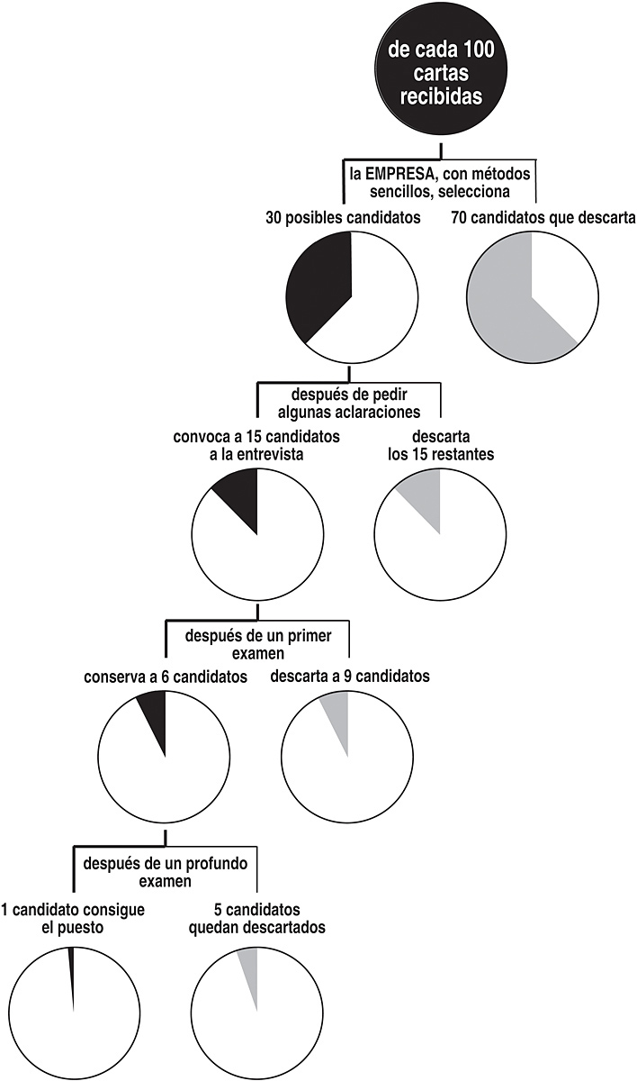 ¿Cuál es el destino de nuestras respuestas a los anuncios de búsqueda de personal? Muchas de ellas no reciben ningún tipo de contrarrespuesta, ni siquiera negativa. Después de haber analizado las posibles causas de ausencia de éxito, veamos en la figura de la página siguiente lo que nos dicen las estadísticas.