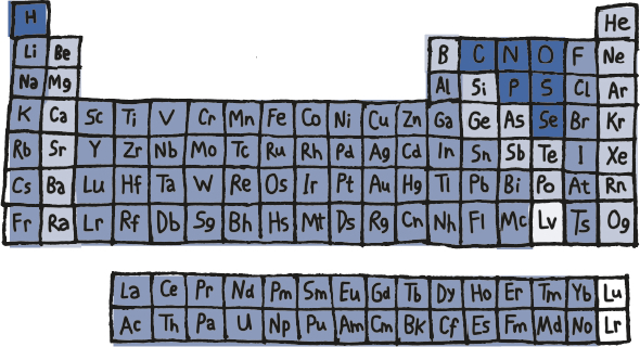 Pero, ojo, porque no todos esos elementos químicos son igual de abundantes en nuestro entorno. Por ejemplo, las rocas que componen la corteza terrestre están hechas de un 46,6 % de oxígeno (O), un 27,7 % de silicio (Si), un 8,1 % de aluminio (Al), un 5 % de hierro (Fe), un 3,6 % de calcio (Ca) y un 2,8 % de sodio (Na). En cambio, el elemento más escaso de la corteza terrestre, el iridio (Ir), se encuentra en concentraciones de alrededor de 50 partes por mil millones.
