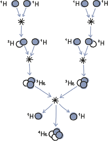 Pues, bien, cuando un núcleo de deuterio colisiona con uno de hidrógeno, las tres partículas involucradas se unen y dan lugar a un núcleo de helio-3 (3He). Y, a su vez, la unión de dos núcleos de helio-3 genera helio-4 (4He) que nuestra estrella no puede seguir fusionando para obtener energía, ya que su interior no está lo bastante caliente. Sin embargo, la formación de 4He expulsa dos núcleos de hidrógeno que quedan libres para unirse con otros núcleos y continuar alimentando la cadena de fusión.