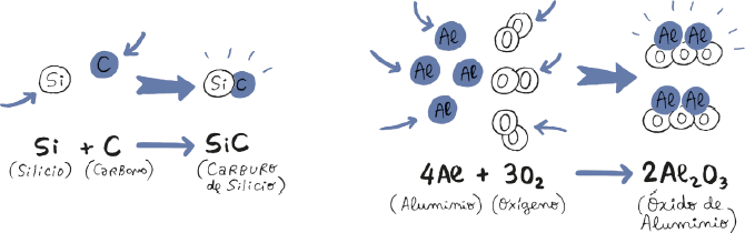 En el siguiente dibujo podéis ver las reacciones químicas que dan lugar al carburo de silicio y al óxido de aluminio, junto con las uniones de átomos que representan esas ecuaciones.
