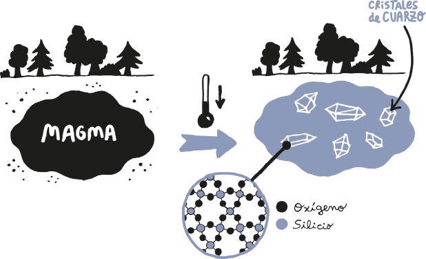 Esta «unión ordenada» de átomos da lugar a unas masas sólidas llamadas cristales. Y, a su vez, los cristales que se forman de manera natural mediante procesos geológicos son los famosos minerales. De hecho, el SiO2 cristalizado es el mineral conocido como cuarzo, el KAlSi3O8 es la ortoclasa y el Fe3O4 es la magnetita.