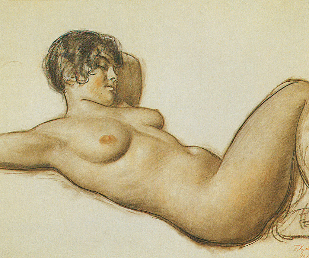 Boris Kustodiev, Reclining Model, 1915. Charcoal, sanguine, and colored pencils on paper, 47 x 57 cm. Brodsky Memorial Museum, St. Petersburg.