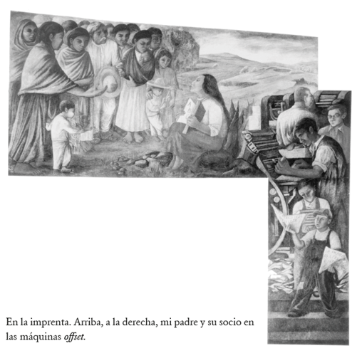 Mi padre estudió en la Escuela Nacional Preparatoria que en tiempos virreinales fue el antiguo colegio jesuita de San Ildefonso. Uno de los edificios más bellos de la ciudad. En 1922 el ministro de Educación José Vasconcelos encomendó a los muralistas José Clemente Orozco y Jean Charlot pintar los muros de la escuela con su visión sobre la Revolución y la historia mexicana. En un edificio muy cercano, Vasconcelos hizo un encargo similar a Diego Rivera: pintar su versión de la epopeya revolucionaria. Mi padre, como toda su generación preparatoriana, creció contemplando esos murales. Además, era amigo de Guadalupe Rivera, la hija de Diego. Me contó que iban juntos a visitar a Diego que pintaba entonces los murales en el Palacio Nacional. En un viaje a Guadalajara, Lupe le presentó a Orozco, que pintaba los murales del Hospicio Cabañas. Me contó que Orozco era difícil y algo hosco, mientras que Diego era expansivo y afable. Ese es el antecedente. En 1952 mi padre encomendó el mural de su fábrica a la pintora Fanny Rabel. Proveniente de Polonia, como mis padres, Fanny era una militante de izquierda, muy amiga de Frida Kahlo y discípula directa de Diego Rivera. El mural representaba una variación de La maestra rural, el famoso fresco en la Secretaría de Educación Pública: en un árido paraje del campo mexicano, como en una misa cívica, un público respetuoso y atento escucha a la maestra: un viejo campesino con su sombrero en mano, una mujer con su bebé bajo el rebozo, hombres circunspectos, mujeres descalzas, un niño con una hoja de maíz. Era la imagen del pueblo. Pero al lado, en vez del guardia rural de la escena original, destacaban las prensas de pie y las máquinas offset en plena producción de unas publicaciones. Mi padre y su socio Alfonso aparecían también, trabajando con los obreros. En el extremo inferior un humilde niño vestido de overol y con cachucha voceaba los impresos que llevaba en sus manos. Podrían ser periódicos o revistas. En uno de ellos se leía: «La imprenta al servicio de la cultura». Yo sueño con esa imprenta. Han pasado casi setenta años desde que comencé a trabajar ahí, y nunca dejé de frecuentar a los obreros. Aún veo a los pocos sobrevivientes.