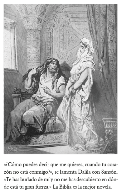 Las vidas de personajes. Para mí la Biblia era una serie de biografías memorables: Abraham y Sara, Isaac y Rebeca, Jacob, Leah y Raquel, José y sus hermanos, Moisés y Josué, los jueces (Gedeón, Jefté), el profeta Samuel. Aunque la presencia de Dios es continua, en muchos casos –sobre todo en el libro de los Reyes–6 la humanidad de los personajes se aparta un poco de la divinidad. ¿Qué hay más humano que el rey David, arpista y poeta, guerrero y amante, castigado por sus horribles pecados, redimido de sus pecados? ¿O el drama de Sansón, loco de amor por Dalila, cegado por sus enemigos filisteos? ¿O el idilio de Ruth, la moabita, que se enamoró de Boaz y le dijo: «tu pueblo será mi pueblo, tu Dios será mi Dios»? El de ellos fue el primer matrimonio mixto de la historia y de él, según el Evangelio, provenía Jesús. Esas fueron las biografías de la primaria. Más tarde, leí a los profetas. Ezequiel, que predicó ante un osario y presenció el espectáculo pasmoso de la resurrección; Jonás dentro de la ballena, que tiene algo kafkiano: el hombre solitario engullido por el animal; Daniel, que leyó la escritura en la pared sobre la destrucción de los imperios. Los leía como en un trance.