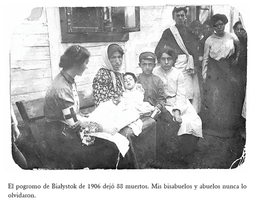 Un abolengo que reconozco y guardo con orgullo. Un socialismo que entiendo y justifico. Te pongo el ejemplo de mi abuela Gueña. Cuando nació, en 1902, y hasta el final de la Primera Guerra Mundial, buena parte de Polonia, y desde luego su ciudad natal, Białystok, vivía bajo el imperio zarista. Por eso Rusia era una realidad tangible en su vida. Mi abuela conservó siempre el gusto por la cultura rusa, sobre todo su literatura y su música. Yo creo que me lo heredó, porque la música clásica que recuerdo de niño era toda rusa: cuartetos, conciertos, sinfonías, ballets de Borodin, Rimski-Kórsakov y Músorgski, Chaikovski. Culturalmente, muchos judíos admiraban a Rusia, pero políticamente detestaban el zarismo, y con razón. Por Gueña supe del pogromo de 1906 en Białystok, provocado –como todos– por las autoridades rusas bajo la orden directa de Nicolás II. La población polaca no intervino, y hubo casi cien muertos, fotos de cuyos cuerpos hacinados junto al cementerio pude ver años más tarde publicadas en libros y en la red. El testimonio de Gueña era vívido pero heredado de sus padres y tíos, y de su esposo José, que vivía en Kuznitza, pueblo vecino de Białystok, y tenía doce años cuando ocurrió. Años después del pogromo, en un asalto perpetrado por cosacos, Gueña protegió a sus padres anteponiendo su cuerpo al de ellos, abrió los armarios y les dijo: «Llévense todo, pero respeten su vida». Era una mujer valiente.