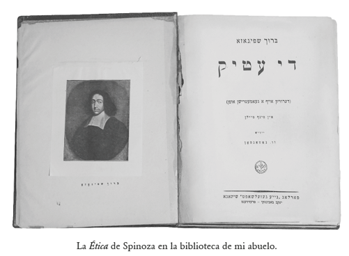 Hay una edición de la Ética en ídish de una casa editorial de Chicago, que parte de una edición polaca de 1923. El Tractatus theologico-politicus no está en esta biblioteca. Lo editó una casa de Nueva York (Farlag Max Jankovitz, 179 East Broadway) de la que mi abuelo era suscriptor. Publicó a Oscar Wilde, Thomas Paine, Victor Hugo, Leonid Andréiev, Anatole France, Romain Rolland. Muchos de esos libros están aquí. Te dan una muestra de su idealismo social.