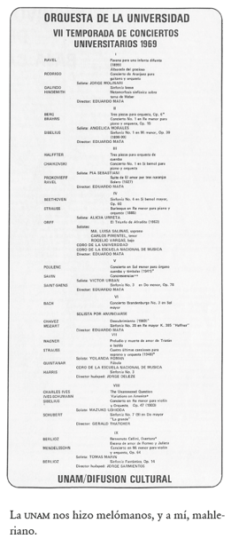 Lo que recuerdo está ligado a la cultura. La Ciudad de México era la capital cultural del país y yo sentía que la UNAM –es decir, la Ciudad Universitaria– era la capital de esa capital. Era un espacio monumental, hermoso y libre, donde florecía el conocimiento, la investigación, la cultura y los deportes. Seguramente la idealizo, pero así la recuerdo. Las librerías universitarias eran una maravilla, con su gran surtido de editoriales mexicanas, argentinas y españolas. Radio UNAM transmitía todo el día el mejor repertorio clásico y fue, junto con la XELA (la otra benemérita estación de música clásica), nuestra universidad musical. Esto se dice fácil, pero la cultura musical de varias generaciones se formó ahí, escuchando por horas el repertorio riquísimo de esas estaciones. Ellas nos prepararon para apreciar las temporadas de conciertos de la Orquesta Filarmónica de la UNAM. Una, de verdad espectacular, comprendió todas las sinfonías de Mahler dirigidas por el joven e impetuoso Eduardo Mata. La UNAM que te describo era un espejo de aquel México que comenzaba a verse menos a sí mismo y más al mundo. Había conferencias, cineclubs y obras de teatro clásico y experimental. Magníficas exposiciones de arte moderno.