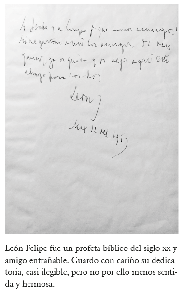 sus lentes gruesísimos, su boina, su barba venerable, su ronca voz, su bastón. Nos saludaba de beso. Lo veíamos en su modesto departamento de la calle de Miguel Schultz, que en realidad era una celda franciscana: una cama, un librero, un crucifijo. Comíamos en el comedor exterior las patatas con huevo duro que nos servía Trini, su cocinera. Nos dedicó a Isabel y a mí un largo poema que acababa de escribir titulado «Israel». Te dije que mi hijo León se llama así por Trotski pero también en homenaje al otro León, el querido León Felipe.