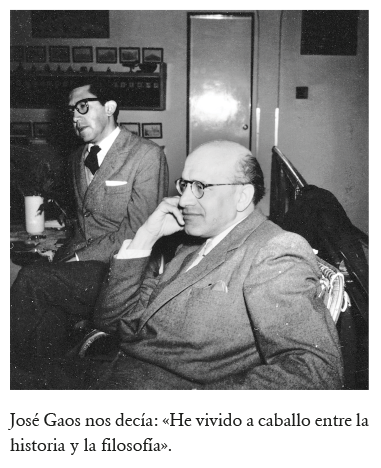 Gaos había sido por muchos años el maestro venerado de filosofía en la UNAM pero en 1966 renunció a su cátedra como protesta por la forma brutal en que se había expulsado al rector Ignacio Chávez. Y se había concentrado en El Colegio de México, donde desde 1964 impartía un curso de historia de las ideas. Fui el último alumno que pisó su cátedra. Aunque era oyente, intervenía un poco en las clases. Gaos era delgado, parsimonioso, formal, etéreo. Tenía algo de monje seráfico en su aspecto. (Luego supe que era nadador, lo cual no contradecía su actitud solitaria y estoica.)