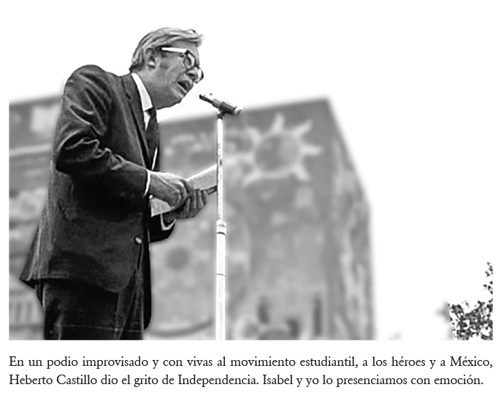Fui solo uno de los cientos de miles de estudiantes que en las calles y en los mítines dijimos no al gobierno autoritario, a su vieja retórica y sus mentiras, a sus crímenes, y al presidente Gustavo Díaz Ordaz, uno de los más autoritarios de la historia mexicana. Las imágenes no han cambiado mucho. Fue como una erupción volcánica. Estábamos conscientes de la ola «contestataria» que recorría el mundo, de París a las universidades de Estados Unidos. Leímos con entusiasmo la crónica ilustrada París, 1968, de Carlos Fuentes. Sabíamos que esa ola llegaría a México. Recuerdo la marcha encabezada por el rector Javier Barros Sierra en protesta contra el «bazucazo» del ejército que derribó el portón virreinal de la Escuela Nacional Preparatoria en San Ildefonso para apresar estudiantes. Isabel y yo nos unimos a esa manifestación, atraídos por el imán de la historia. Exaltados, recorrimos las calles al grito de «¡Únete, pueblo!». La inocente porra deportiva de la universidad –llamada «Goya»– que coreamos en la avenida Félix Cuevas –mientras los militares nos acechaban– se volvió un acto de rebelión. Luego, por tres meses alucinantes, participamos en las marchas y mítines, ayudamos con materiales mimeografiados y boletines. El líder del movimiento en la facultad era Salvador Ruiz Villegas, un norteño grandote, recio y elocuente cuyas arengas nos encendían. Un día, en la explanada contigua al Auditorio de Ingeniería, escuché por primera vez al maestro Heberto Castillo, ingeniero eminente y militante de izquierda, que venía de la Tricontinental de Cuba. La tarde del 15 de septiembre acudimos al grito de Independencia que dio Heberto en la explanada de la rectoría. Nunca gritamos «¡Viva México!» con mayor pasión. Tres días después el ejército allanó la UNAM.