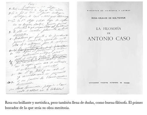 No que yo recuerde, porque esa materia era la especialidad de su padre el sastre. Rosa me enseñó a hacer fichas de investigación y me dio nociones de historia de la filosofía, que era la clase que impartía a los recién llegados a la Facultad de Filosofía en la UNAM. Un día me explicó con toda claridad el idealismo mediante el mito de la caverna de Platón y la noción del topus uranus, y acto seguido pasó a la diferencia con el realismo de Aristóteles. Tenía un don pedagógico natural que combinaba con una actitud maternal, y una gran experiencia. Sus intereses fluctuaban entre la literatura y la filosofía, y terminó escribiendo su tesis de doctorado sobre un tema que las vinculaba a las dos. Se tituló Los seres imaginarios. Ficción y verdad en literatura. Tenía casi setenta años de edad cuando se recibió. Mi tía fue una mujer de inmenso mérito, no reconocida suficientemente por su condición de mujer. Ahora mismo, ser mujer intelectual en México es difícil. Serlo en ese tiempo lo era aún más. Tenía que lidiar con intelectuales depredadores, displicentes, arrogantes. Navegó en esas aguas con fortaleza y dignidad. Y dejó una obra muy valiosa. Sin su amorosa edición de Antonio Caso, ese gran filósofo mexicano habría sido más olvidado de lo que ha estado. Caso, por cierto, fue el maestro principal de la generación de 1915, la de Manuel Gómez Morin, Vicente Lombardo Toledano y Daniel Cosío Villegas (entre muchos otros). Así que, en cierta forma, mi trabajo de historiador se desprende de la obra de mi tía Rosita.