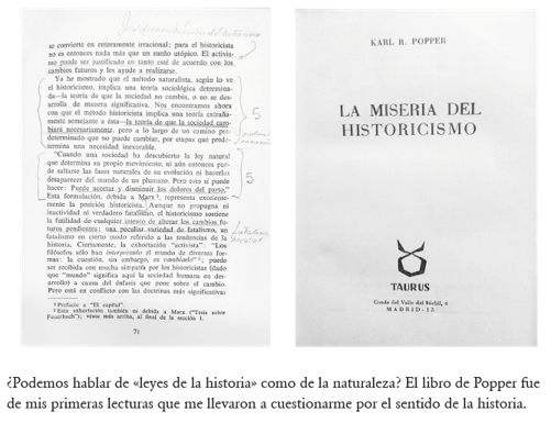 Yo no entendía las fórmulas matemáticas y lógicas del libro, pero me atraía la crítica, el método científico, la idea del «ensayo y error» y la refutación como instrumento de progreso en el conocimiento. Simplemente comprendí que la filosofía tenía una aplicación directa en el conocimiento histórico y, a partir de ahí, en el pensamiento político: servía para desmantelar el dogmatismo historicista (así lo llamaba Popper), desmontar los sofismas de la dialéctica, desmentir la idea de que existen leyes en la historia. No es posible profetizar nada. Por lo demás, como aprendí ese mismo año en El Colegio de México, lo importante en el quehacer histórico es comprender el sentido de los hechos.
