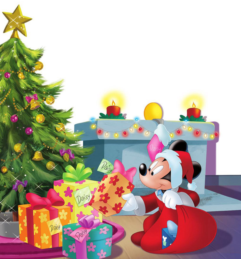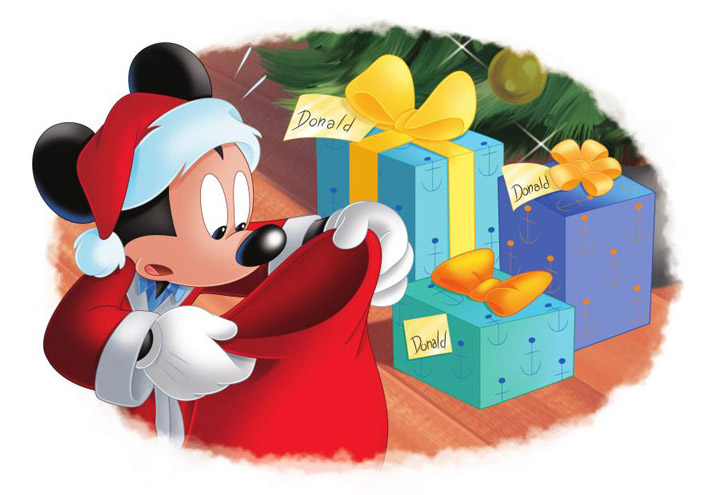 Mickey consultó la lista y sacó los regalos de su amigo del saco de Papá Noel.