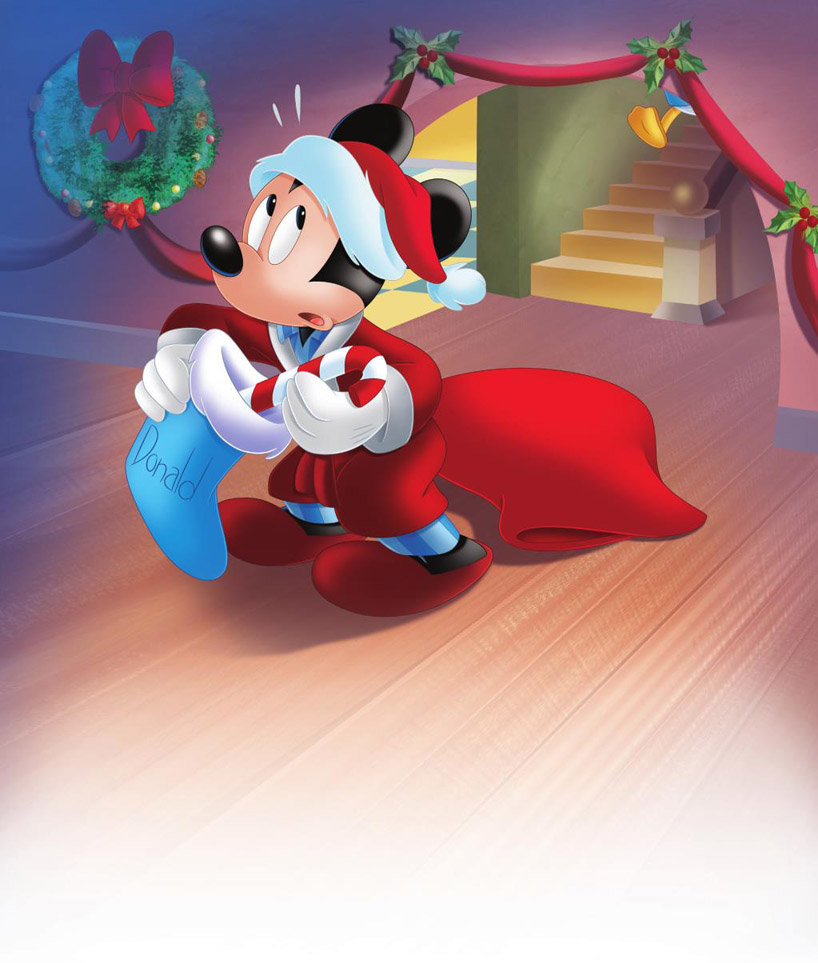 Mickey rellenó a toda prisa el calcetín de su amigo. Ya había terminado cuando vio los pies de Donald en lo alto de las escaleras.