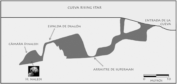 Figura 4. Plano de la cueva Rising Star, con el lugar donde se encontraron los restos esqueléticos del Homo naledi.