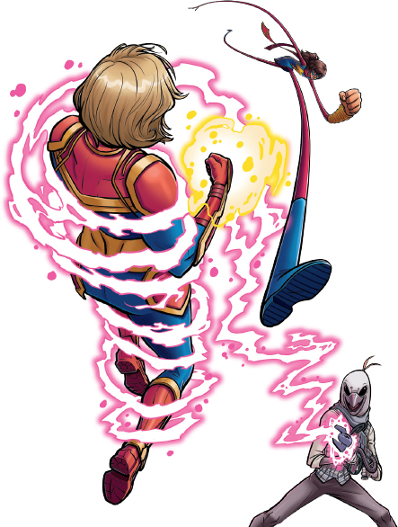 A continuación, dispara media docena de misiles hacia las dos heroínas. Por su parte, la Capitana Marvel levanta los puños, que comienzan a brillar con un poder sobrenatural. Kamala estira su cuerpo y lanza todo tipo de vehículos sobre el Inventor. Finalmente, la Capitana neutraliza la nave del villano con una descarga de energía y Ms. Marvel lo atrapa en el aire.
