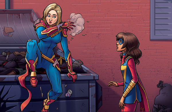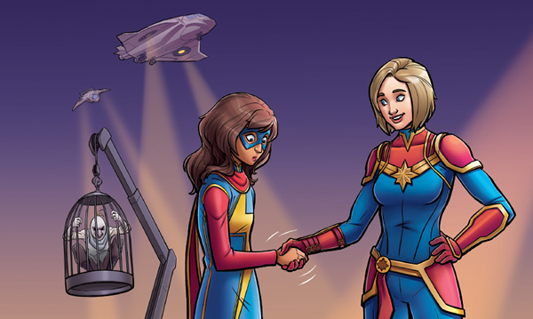 Sin decir nada más, la Capitana Marvel sale disparada hacia el espacio. Ms. Marvel permanece allí durante un buen rato, viendo cómo la estela de luz se desvanece y desaparece. La Capitana Marvel le ha dado la mano. Y la ha tratado como una compañera.