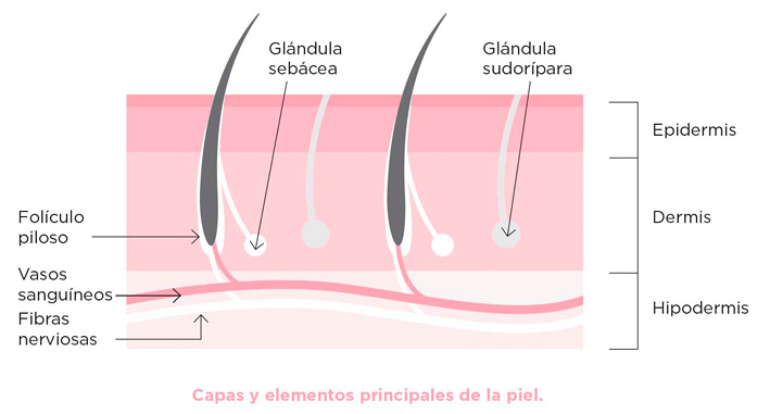 La piel está formada por diversas capas. Si la recorremos desde el exterior hacia el interior, nos encontramos con la epidermis, la dermis y la hipodermis.