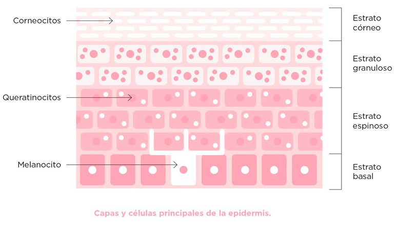 La pigmentación (o color) de la piel se debe a los melanocitos, unas células especializadas que se encuentran en la epidermis, la capa más externa de la piel. En concreto, se encuentran en el estrato basal, que es la capa más profunda dentro de la epidermis y la que da lugar a los queratinocitos, las células que migran hacia el exterior y que nos sirven de aislante del ambiente en el estrato córneo.