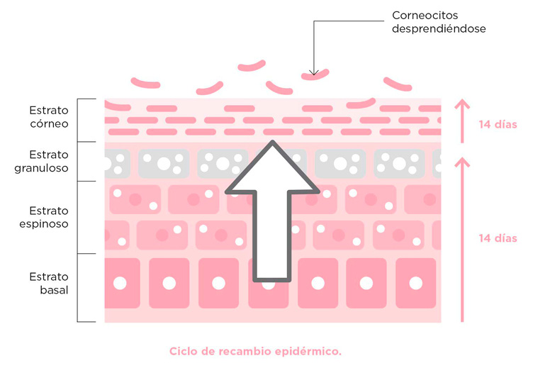 Los humanos estrenamos una epidermis nueva cada 28 días aproximadamente, ya que esta se encuentra en un proceso de renovación continuo llamado «recambio epidérmico», que completa un ciclo equivalente al tiempo de vida de un queratinocito desde que nace hasta que se desprende. Y es que los queratinocitos se dividen («nacen») en la subcapa más interna, el estrato basal, y van madurando y desplazándose a su vez («viajando») hacia las capas más externas de manera progresiva, hasta llegar a la capa superior, donde ya han perdido el núcleo y se han llenado de queratina (es decir, han llegado al final de su vida y son literalmente «células muertas») y se desprenden del cuerpo. La duración de este ciclo es de unos 28 días de media, pero depende de diversos factores, entre los cuales figura el envejecimiento, tal como veremos más tarde.