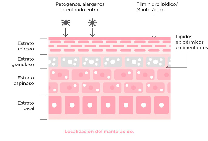 Un manto ácido sano contribuye a una óptima función barrera de la piel, ya que permite la correcta formación de los lípidos epidérmicos, una descamación normal y los procesos de reparación del estrato córneo que suceden si este se ha visto lastimado.