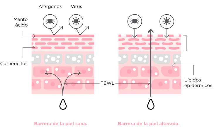 El manto ácido es delicado y puede dañarse con facilidad. Un manto ácido alterado permite una mayor pérdida de agua transepidérmica o TEWL (por sus siglas en inglés); veremos enseguida qué es esto. En consecuencia, se produce deshidratación y se facilita la entrada de organismos patógenos, alérgenos, etc.