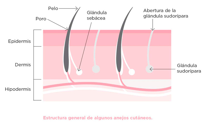 GLÁNDULAS SEBÁCEAS: Producen el sebo que formará parte de la película hidrolipídica. El sebo se vierte sobre el folículo piloso y, en última instancia, la salida del sebo hacia la superficie del estrato córneo se produce a través de la misma abertura por la que sale el pelo: los poros. Una glándula sebácea siempre está asociada a un pelo, y viceversa, formando cada una de estas «parejas» las unidades pilosebáceas.
