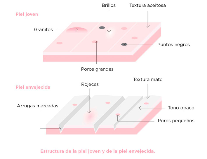 El envejecimiento de la piel es un proceso continuo en el que progresivamente se van produciendo cambios en la forma y la función de la piel. Algunos de los efectos derivados del envejecimiento de la piel son la formación de arrugas, la laxitud (falta de firmeza) y las modificaciones en la pigmentación (manchas en la piel).
