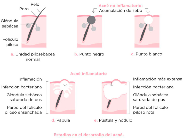 Por otro lado, ¿recuerdas a Cutibacterium acnes de apartados anteriores? Precisamente debido al uso de cubrebocas se altera el equilibrio en su población y se favorece su crecimiento excesivo. En consecuencia, se infecta el folículo piloso, ya que nuestra respiración genera un ambiente húmedo y cálido, que se mantiene en el tiempo y en el que la bacteria encuentra un medio perfecto. A este cóctel añádele la acumulación de suciedad en los cubrebocas, el uso de cosméticos inadecuados, la barrera de la piel alterada por el roce del propio cubrebocas… Todos estos factores, acompañados de una producción excesiva de sebo, son el caldo de cultivo perfecto para la aparición y el desarrollo de lesiones de acné de todo tipo.
