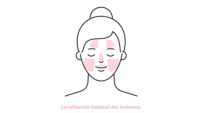 El melasma se muestra en la piel en forma de manchas que aparecen con más frecuencia en el centro del rostro de mujeres en torno a los 30-40 años, en especial en frente, mejillas, zona superior del labio y nariz, y de manera simétrica. Son manchas que suelen oscurecerse en verano y mejorar en invierno, y adoptan distintos tonos de café.
