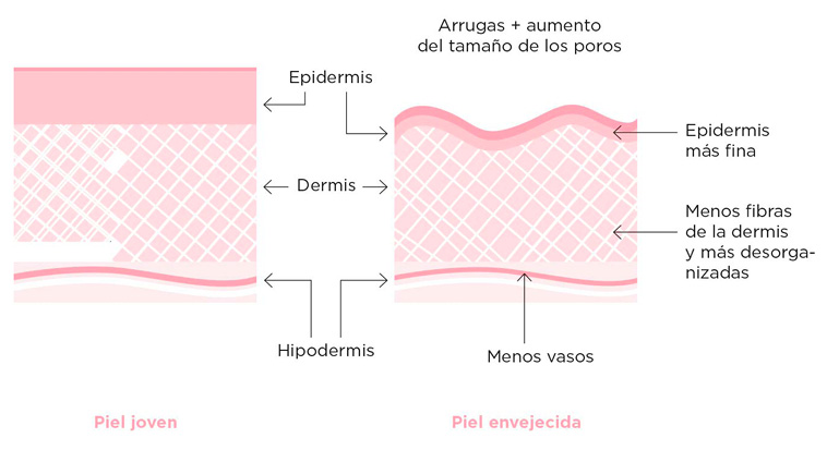 Y ahora presta atención. A continuación se describen los cambios que se dan en la epidermis y en la dermis con el envejecimiento.