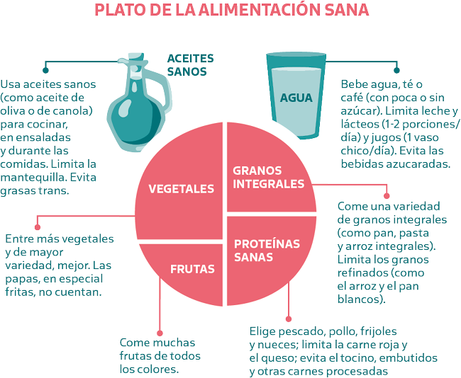 Como puedes ver, es sumamente sencillo. Tomando un plato como ejemplo, es fácil visualizar cómo equilibrar tus alimentos. Yo les pido a todos mis pacientes que impriman este plato, lo peguen en la puerta de su refrigerador y lo utilicen como una pista visual para preparar sus comidas. Puedes encontrarlo en inglés sin costo alguno en hsph.harvard.edu/nutritionsource. Esta es la guía con la que mi familia y yo preparamos nuestras comidas todos los días. Siempre tratamos de seguir la composición de este plato para guiarnos en confeccionar una comida rica, nutritiva y balanceada.