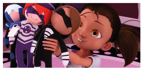 Entre risas y proclamas, la niña hace ver que sus muñecas se abalanzan sobre las de Ladybug y Cat Noir. Marinette mueve sus muñecos para esquivarlas y exclama:
