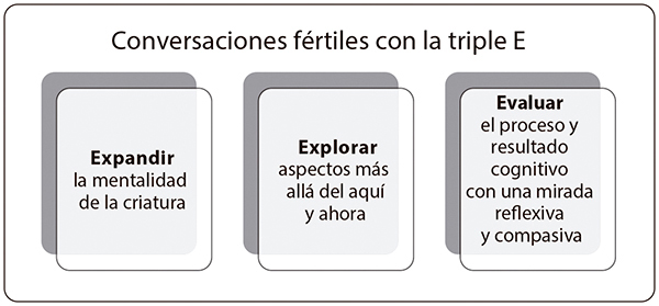 Vale, entonces, ¿cómo introducimos estas conversaciones en nuestra vida? Gracias a mi investigación sobre las interacciones entre niños y adultos, he empezado a usar el método que he bautizado en mi trabajo clínico como «Triple E». La Triple E se basa en una exhaustiva investigación sobre el desarrollo del lenguaje, el pensamiento y las habilidades sociales a distintas edades. Es la base de la conversación fértil, lo que os permitirá participar a ambas partes y os ayudará a marcar el ritmo. Me gustaría que lo vieras como un kit de estrategias que te irá bien tener a mano para sacarlas y usarlas cuando las necesites. Sin más dilación, aquí te las presento: