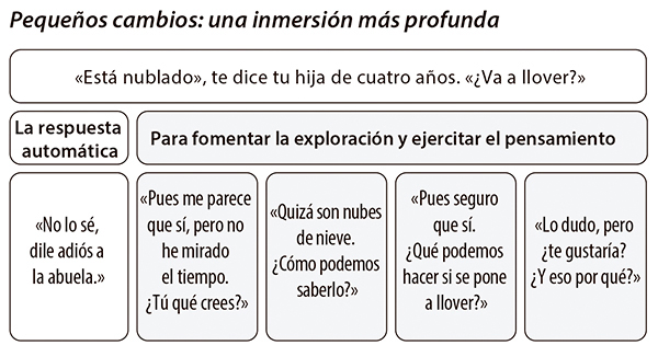 En ambos casos, el padre o la madre no lo sabían todo, la idea no era encontrar la respuesta perfecta, sino lanzar una pregunta para explorar más el tema. La conversación se convirtió en una invitación a buscar nuevas maneras de ejercitar la mente de la criatura: de enseñarle que todos tenemos preguntas y que no tener respuestas puede ser una oportunidad, no algo de lo que avergonzarse.
