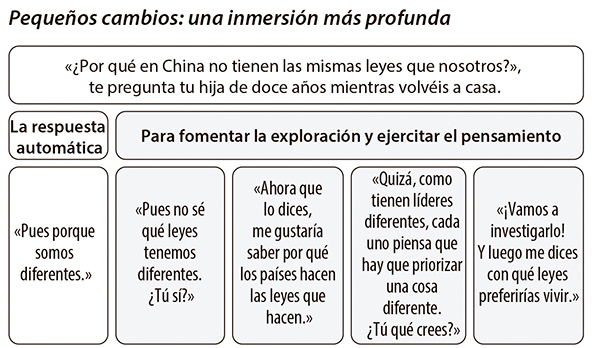 Quizá no podemos responder a todas esas preguntas o quizá ni siquiera a una, pero ahí está el quid de la cuestión: no saber las respuestas nos permite acompañar a nuestros hijos en esa aventura; exploramos, lanzamos más preguntas y quizá incluso hasta aprendemos algo.11Aprovechar y profundizar en estas preguntas les da a nuestros hijos e hijas una mejor comprensión de lo que de verdad significa aprender. Sí, saberse el abecedario es importante, pero aprender es mucho más que memorizar datos. La actitud es mucho más importante: hacer las preguntas difíciles porque son difíciles, dedicarles el tiempo para entenderlas y no contentarnos con la primera respuesta que encontramos.