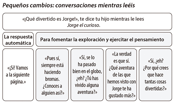 Consejo conversacional: disfrutad juntas del mismo libro. Léele en voz alta, haz que te lea ella a ti o escuchad audiolibros juntas. Pregúntale qué partes le han gustado más. Sobre todo si el libro es gracioso, deja que sea ella quien lea la historia. Si aún no sabe leer, anímala a que te vuelva a contar la historia mirando las imágenes.42