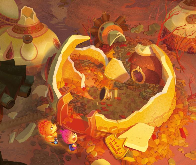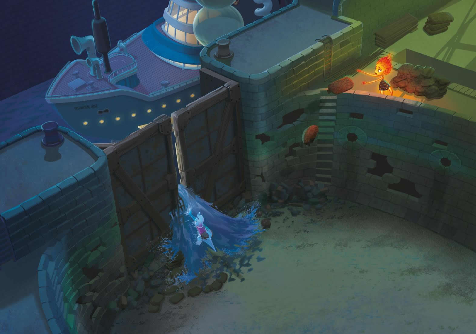 De pronto, el agua echó abajo una pared y los escombros se precipitaron hacia Candela y la Llama Azul. Ella se subió a una caja y le pidió a Nilo que cogiera el farol. Sin embargo, mientras Nilo nadaba hacia él, ¡lo arrolló una enorme ola!