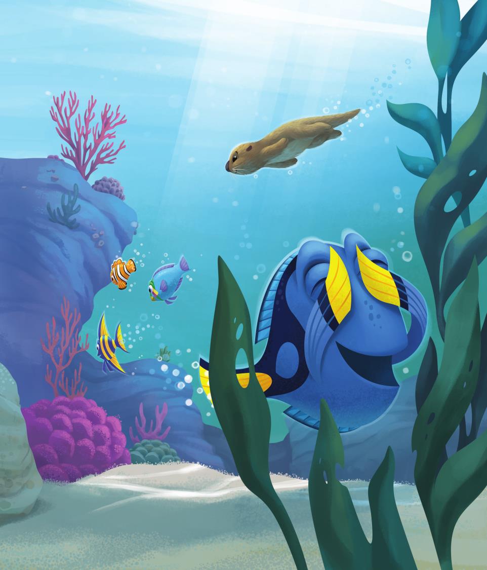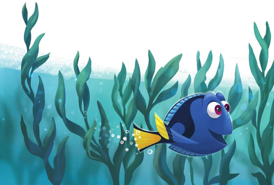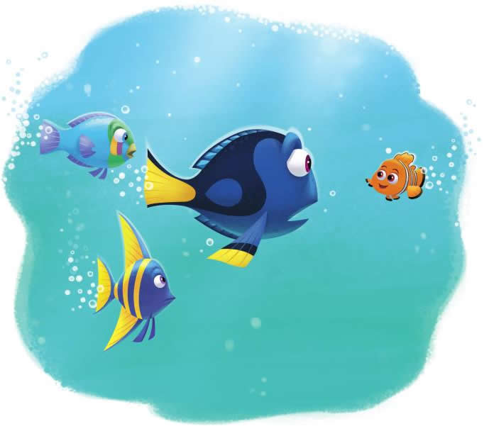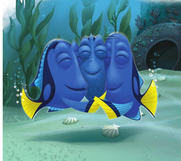 —¡YUPI! ¡Ven a jugar con nosotros! —grita Nemo—. Volvamos a escondernos. Y no lo olvides, Dory, ¡tienes que encontrarnos!