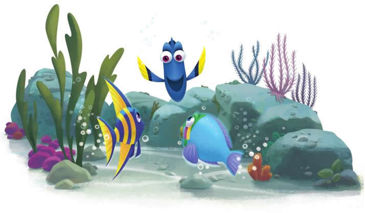 Dory sale a toda velocidad en busca de sus amigos. Primero encuentra a Nemo entre los erizos de mar. Luego encuentra al pez ángel y al pez loro detrás de unas rocas.