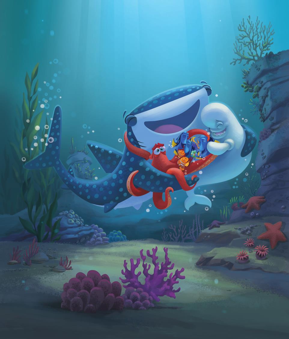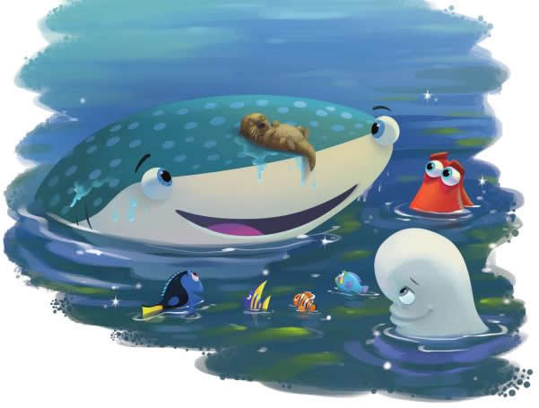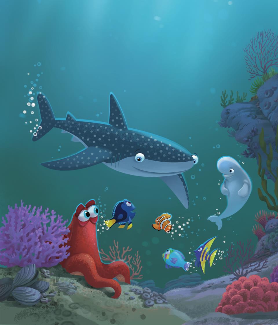 Todos se acercan a Dory: Nemo, Marlin, el pez ángel, el pez loro, Bailey, Destiny, Charlie, Jenny... e incluso el tímido Hank. Ponen sus aletas alrededor de su amiga y le dan un abrazo enorme... ¡El abrazo más grande jamás visto bajo el océano!
