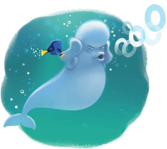 Entonces, Dory le pide a Bailey que utilice su sonar para encontrar a la nutria. Bailey se coloca las aletas en la cabeza y emite un colosal sonido por el océano.
