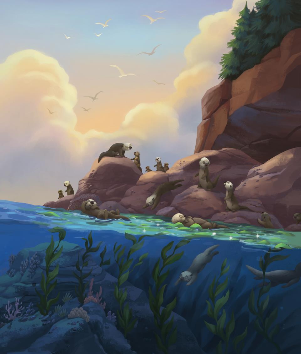 Pronto descubren un numeroso grupo de nutrias que ocupan todas las rocas. Algunas juegan a perseguirse en el agua. Otras bucean en busca de comida. Y algunas duermen, tumbadas de espaldas.