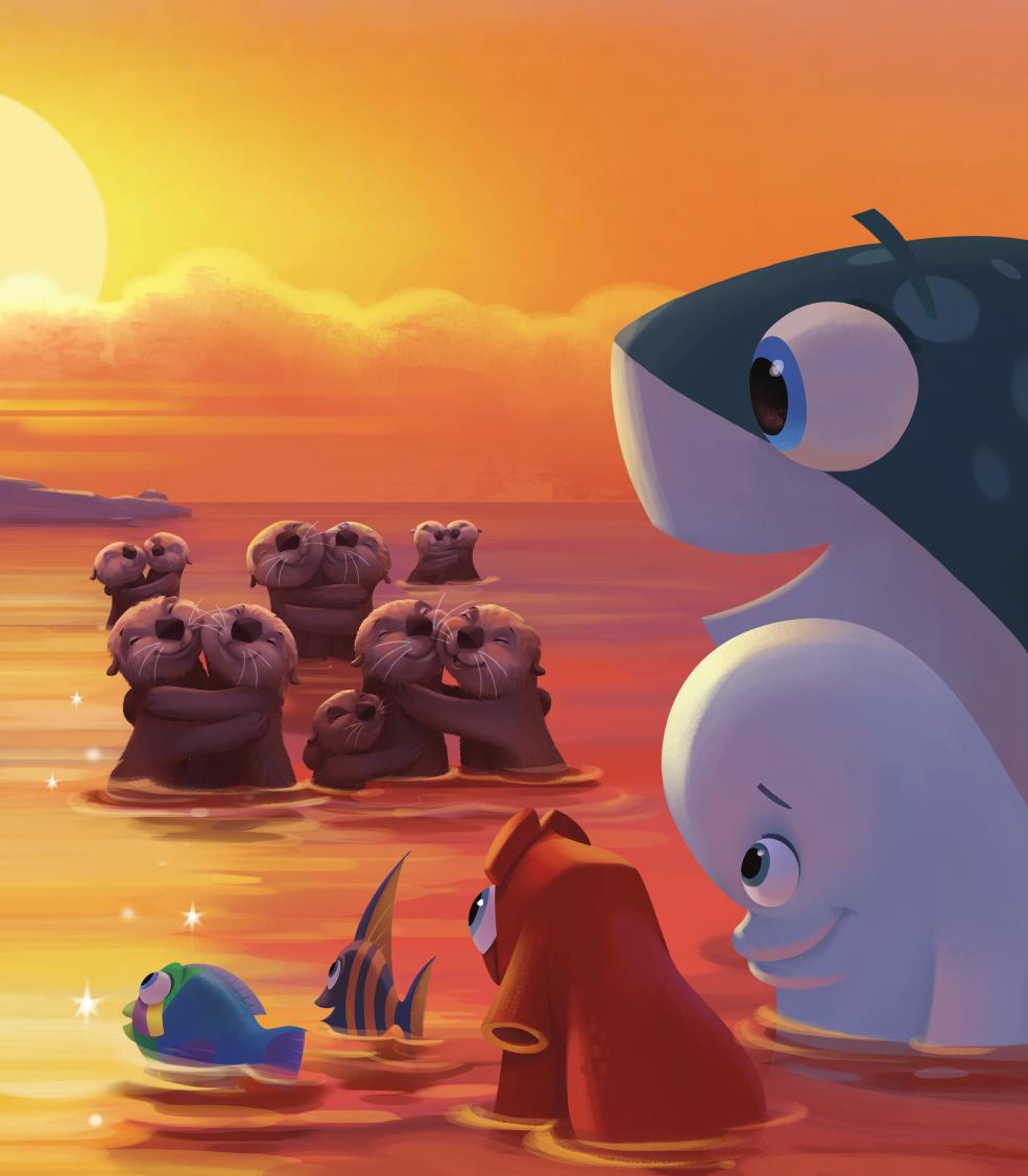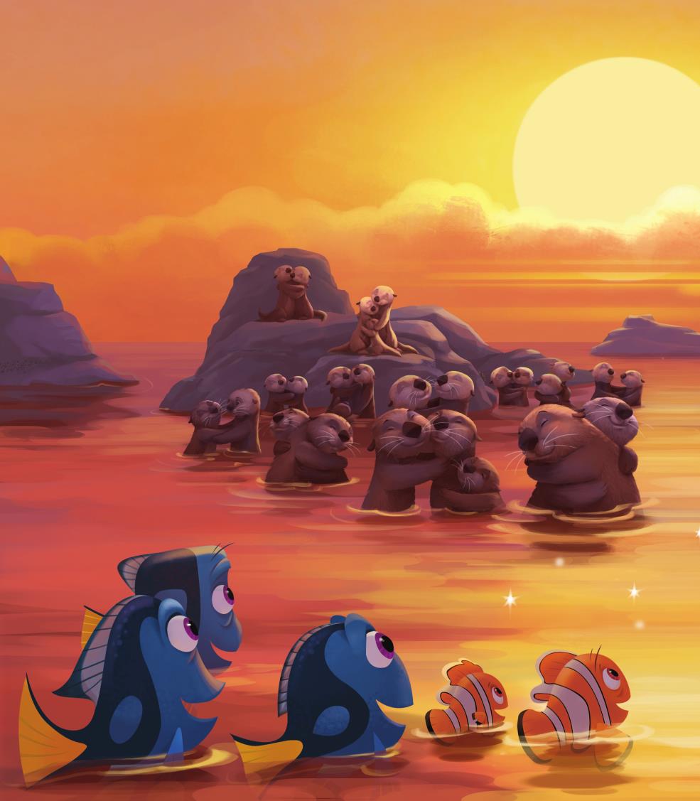 Charlie, Jenny y Marlin se han unido a Dory y a sus amigos. Un poco más tarde, cuando el sol se pone sobre la bahía, todas las nutrias se reúnen. Poco a poco todas se van fundiendo en un abrazo gigante.