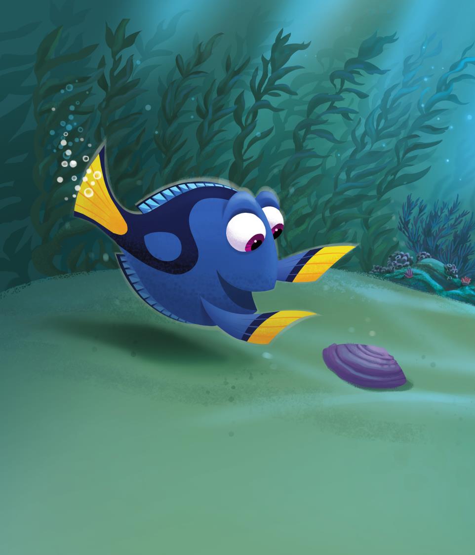 Esta mañana, Dory sale de su casa como una flecha. Ha visto unas preciosas conchas violetas en el fondo arenoso. Se divierte lanzándolas por encima de su cabeza.