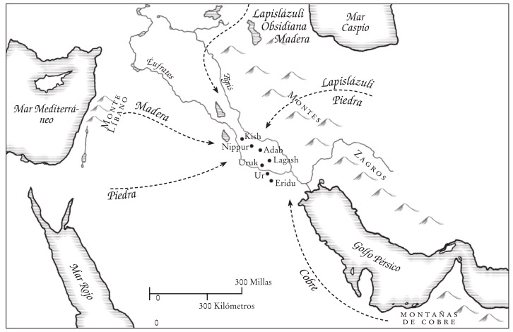 Las ciudades de Mesopotamia eran independientes: cada una era gobernada por un príncipe distinto. Pero Kish estaba situada entre dos ríos, en una posición que pedía a gritos algún tipo de control. Después de todo, en Sumer no había madera: apenas había algunas palmeras importadas, que constituían un material de tercera clase para la construcción. No había piedra, ni cobre, ni obsidiana: nada, salvo barro y algunos depósitos de bitumen o asfalto, utilizado como brea para las antorchas y como aglomerante de mortero. La madera debía transportarse desde los montes Zagros situados al noreste, o del monte Líbano situado al noroeste. El cobre venía de las montañas del sur de Arabia; el lapislázuli, de las tierras rocosas situadas al norte y al este; la piedra, del desierto al oeste; y la obsidiana, de las lejanas tierras del norte. A cambio, las ciudades sumerias ofrecían los bienes propios de una sociedad agrícola: granos, tejidos, pieles y cerámica. Las vasijas y los boles sumerios aparecen desperdigados por multitud de pequeños asentamientos y ciudades de Europa del este y el norte de Asia.