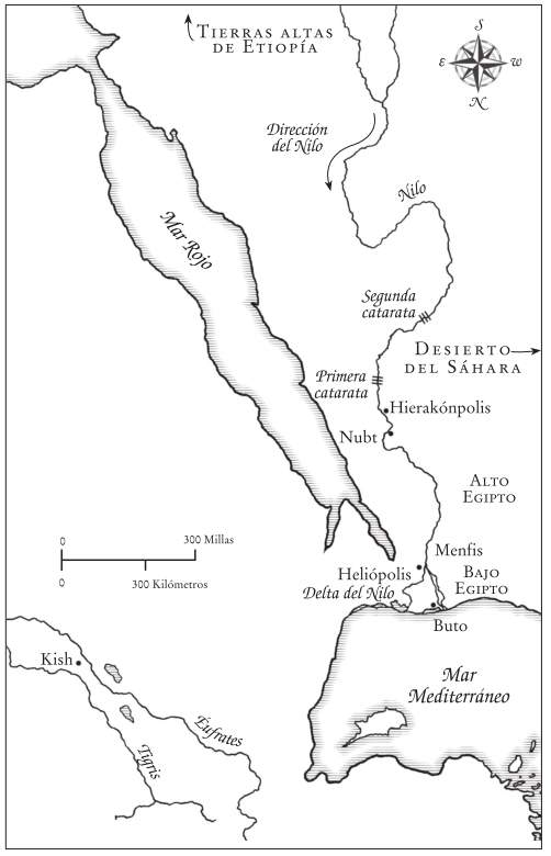 El Rey Escorpión descendía de un pueblo africano que había vivido a las orillas del Nilo. Siglos antes de su nacimiento, en los días en que el legendario Alulim gobernaba sobre una Sumer más fría y húmeda, el valle del Nilo era, con toda probabilidad, una tierra inhabitable. Todos los años, cuando las lluvias caían torrencialmente sobre las montañas del sur, las aguas acumuladas caían en cascada al Nilo y se dirigían hacia el Mediterráneo situado más al norte, inundando las tierras circundantes. Las crecidas eran tan violentas que el número de cazadores y recolectores que vivían en las inmediaciones del río era muy escaso: preferían habitar las tierras situadas al este y al oeste (más hospitalarias), asentarse a orillas del mar Rojo, o vagar por el desierto del Sahara. En aquellos tiempos, más suaves y húmedos, el Sahara era un territorio en el que abundaban el agua y la vegetación. Los arqueólogos han descubierto hojas, árboles y restos de animales debajo de la arena.
