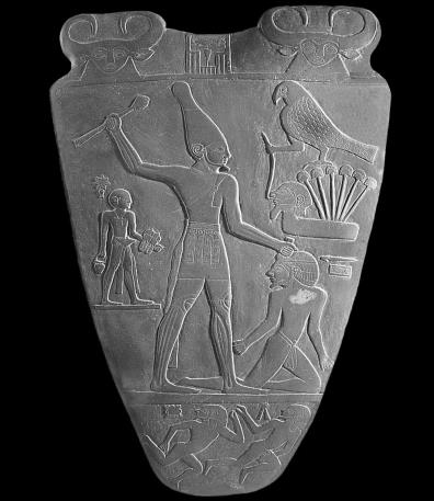 Ilustración 4.2. Paleta de Narmer. El unificador de Egipto golpea a su enemigo, mientras el halcón de Horus le entrega un nuevo cautivo. Museo Egipcio de El Cairo. Fotografía: Werner Forman /Art Resource, NY.