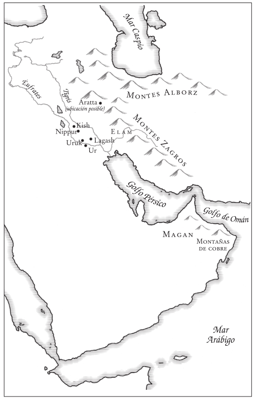 Hacia el año 2800 a.C., el rey sumerio Meskiaggasher gobernaba sobre la ciudad de Uruk. Uruk, convertida hoy en la ciudad de Warka en el sureste iraquí, era una de las ciudades más antiguas de Sumer. Estaba habitada desde al menos el año 3500 a.C.* Durante el reinado de Meskiaggasher era, también, la ciudad más grande de Mesopotamia (hasta donde podemos saber): sus murallas se extendían a lo largo de casi diez kilómetros, y estaba habitada por cerca de cincuenta mil personas. Dos grandes complejos sagrados se levantaban dentro del recinto urbano. En el templo de Kullaba, los sumerios se reunían para adorar al lejano y reticente dios del cielo An; en Eanna, veneraban aún con más vigor a Inanna, la muy accesible diosa del amor y la guerra.**