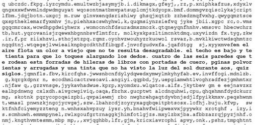 El primer párrafo de este capítulo está en esta biblioteca. Si no te lo crees, se encuentra en el hexágono cuyo número de referencia termina en wmnk6, en la Pared 4, Estante 2, Volumen 1, Página 224. Nosotros no lo hemos introducido; ya estaba ahí:*